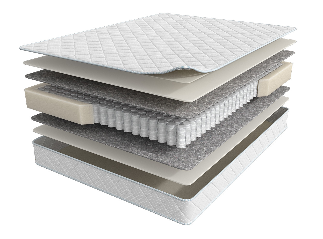 Трикотаж, стеганый на синтепоне, высокоэластичная пена, войлок, блок независимых пружин повышенной надежности, усиление по периметру из ППУ